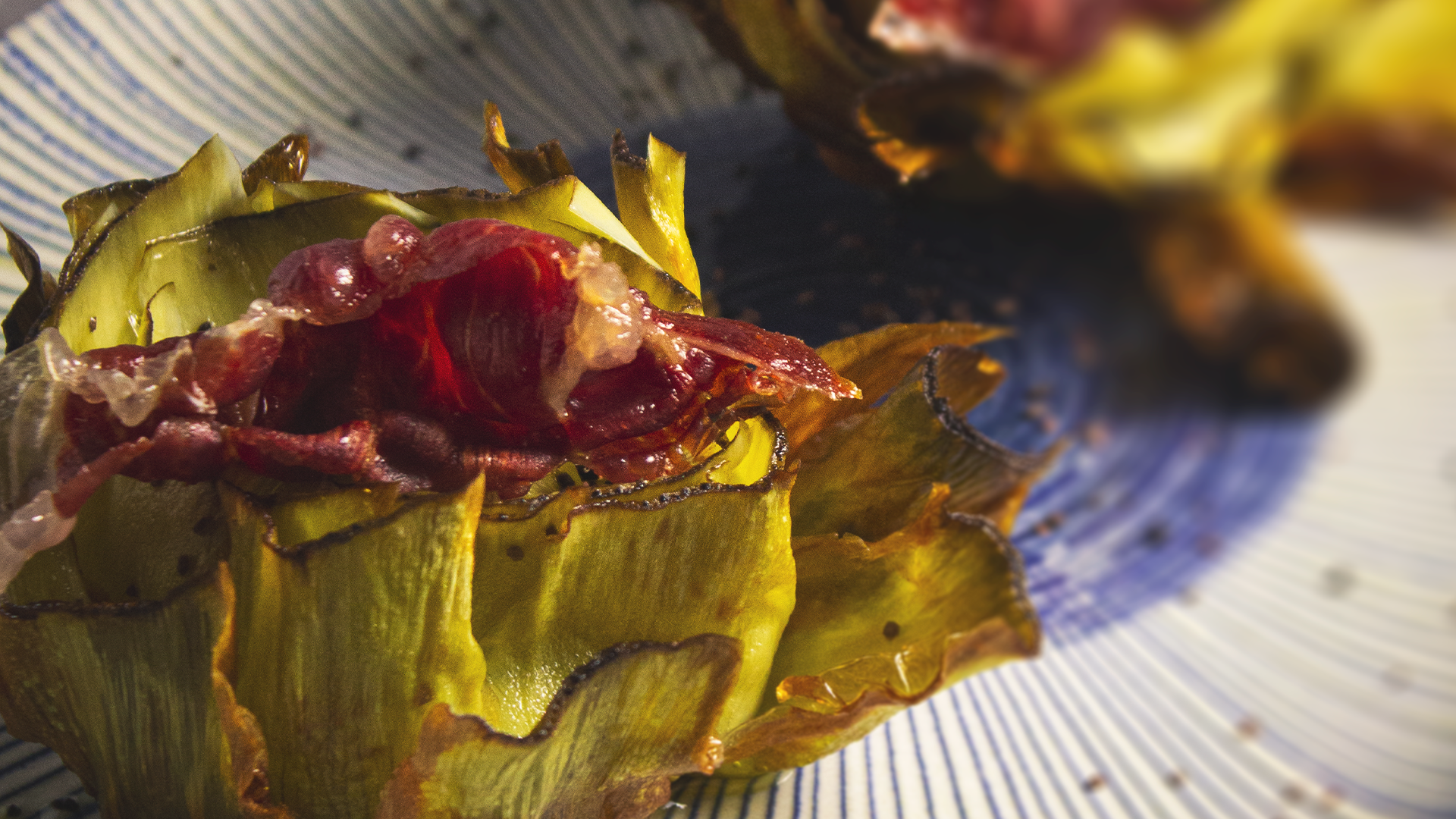 Alcachofas confitadas con sal negra del himalaya y crujiente de jamón
